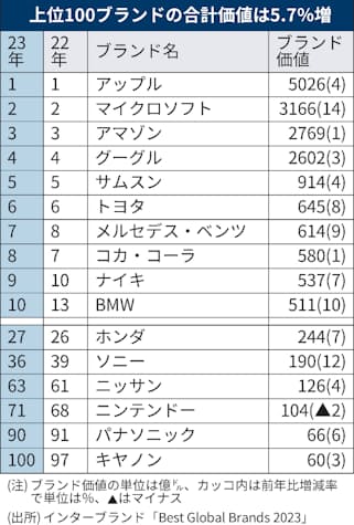 アップルは前年比4%増の5026億ドル(約74兆円)で、ブランド価値が5000億ドルを突破した初のブランドとなった。金融サービスに参入するなど、顧客が体験する価値の幅を広げている。